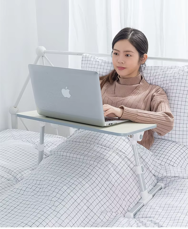 The Foldable Laptop Bed Desk 60×33cm offers a compact and ergonomic workspace with adjustable height, tilt function, and a durable wooden MDF surface. Designed for laptops up to 17”, it provides stable comfort for bed, sofa, or floor use.