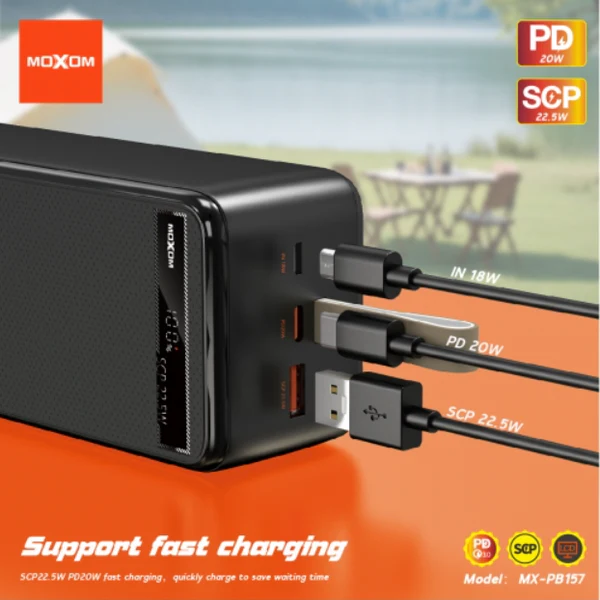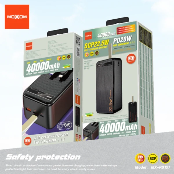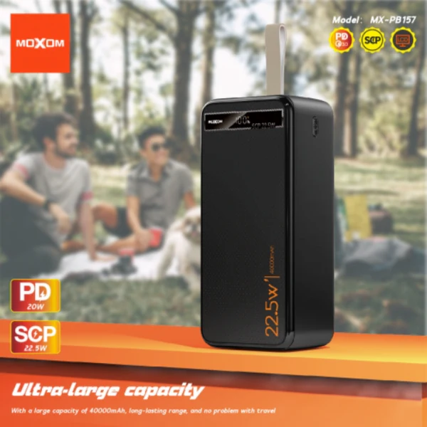 MOXOM 40000mAh ultra-high-capacity power bank with PD 20W and SCP 22.5W fast charging, Type-C and USB ports, ideal for smartphones, tablets, and multiple devices on the go.