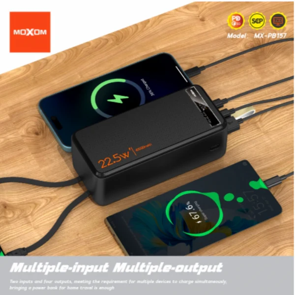 The MOXOM 40000mAh PD20W SCP22.5W Power Bank is designed for users who need extreme charging capacity for multiple devices or long trips. Manufactured by Moxom, it supports Power Delivery 20W and SCP 22.5W fast charging, enabling rapid, reliable power for smartphones, tablets, and other USB-powered gadgets.