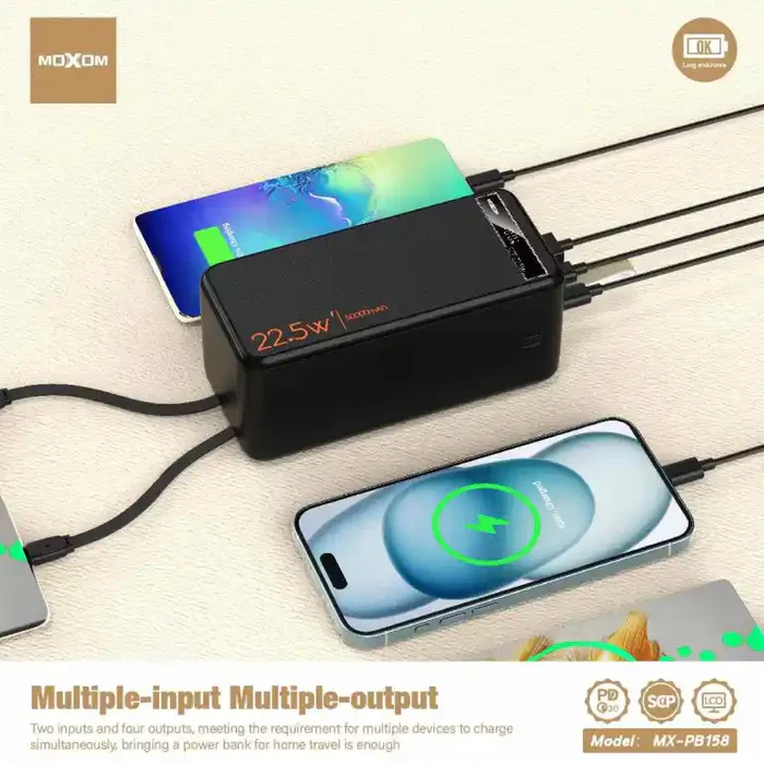 MOXOM 50000mAh ultra-high-capacity power bank with PD 20W and SCP 22.5W fast charging, Type-C and USB ports, perfect for smartphones, tablets, and multiple devices on the go.