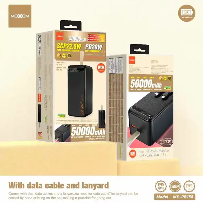 The MOXOM 50000mAh PD20W SCP22.5W Power Bank is the ultimate portable charging solution for extreme power needs. Manufactured by Moxom, it supports Power Delivery 20W and SCP 22.5W fast charging, providing rapid and reliable power for smartphones, tablets, laptops, and other USB-powered devices.