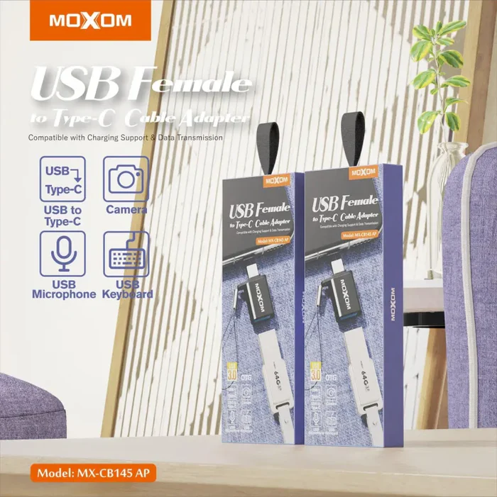MOXOM USB-A female to Type-C male adapter for high-speed data transfer and charging, compatible with smartphones, tablets, laptops, and USB devices.