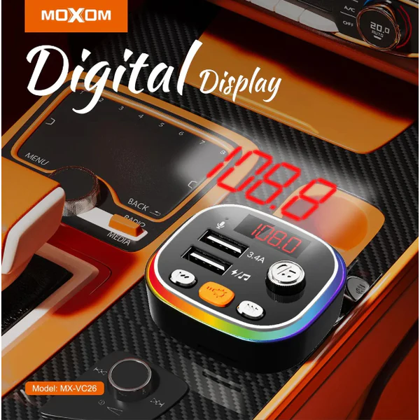 MOXOM dual-port car charger with wireless music streaming via Bluetooth, supporting fast charging for smartphones and tablets while driving.