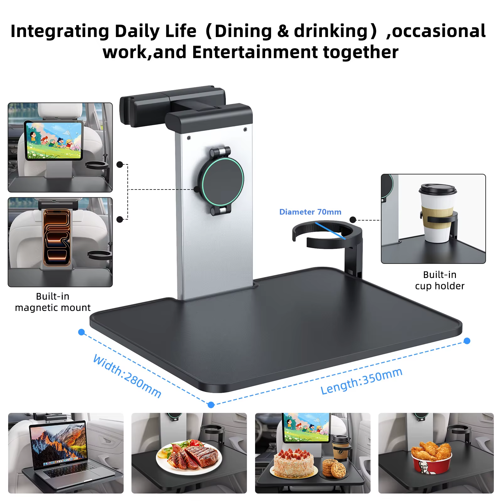 The Rear Car Seat Tray Table is a universal foldable car accessory designed for dining, working, and entertainment on the go. Featuring a metal frame, cup holder, and MagSafe mount, it offers a stable and practical in-car workstation.